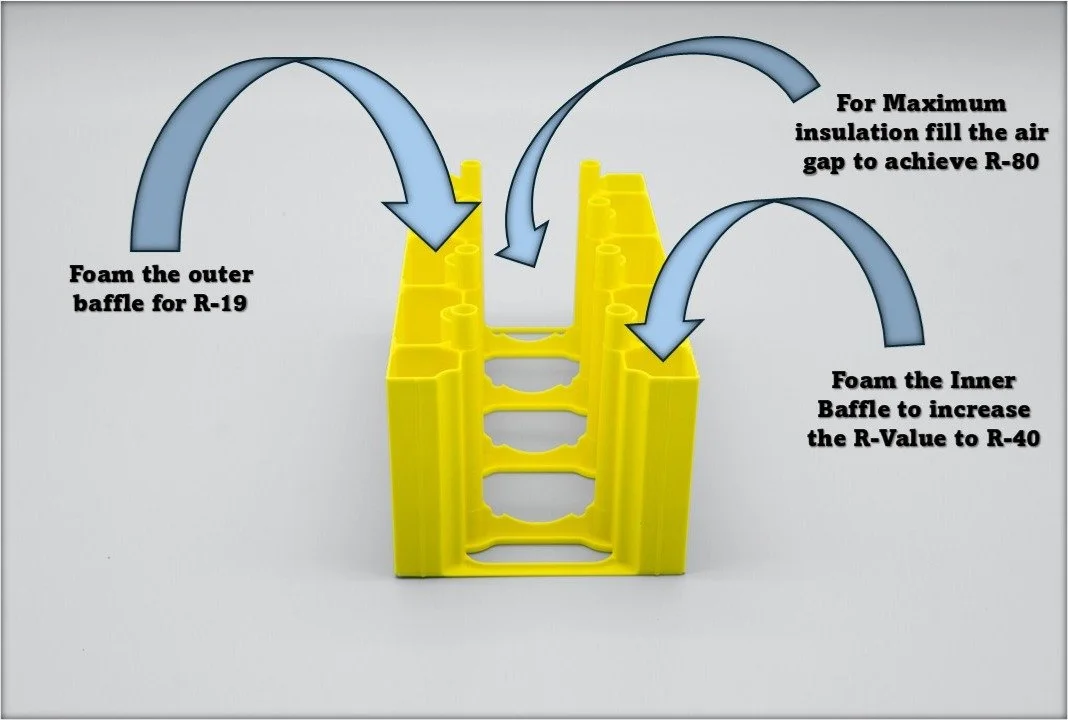 ClimatBlocs are specifically designed to meet the needs and requirements of every climate on earth. Each block is designed and manufactured with two insulation baffles, one on the interior and one on the exterior of the frame. Each baffle can be injected with 2.5” of our foam insulation, providing an R-Value of R-19. If you are building in a temperate climate, R-19 may be prefect however if your location demands more insulation, we can fill both baffles for R-40 or if you live in the frigid artic we will fill the entire block for an industry leading R-84.